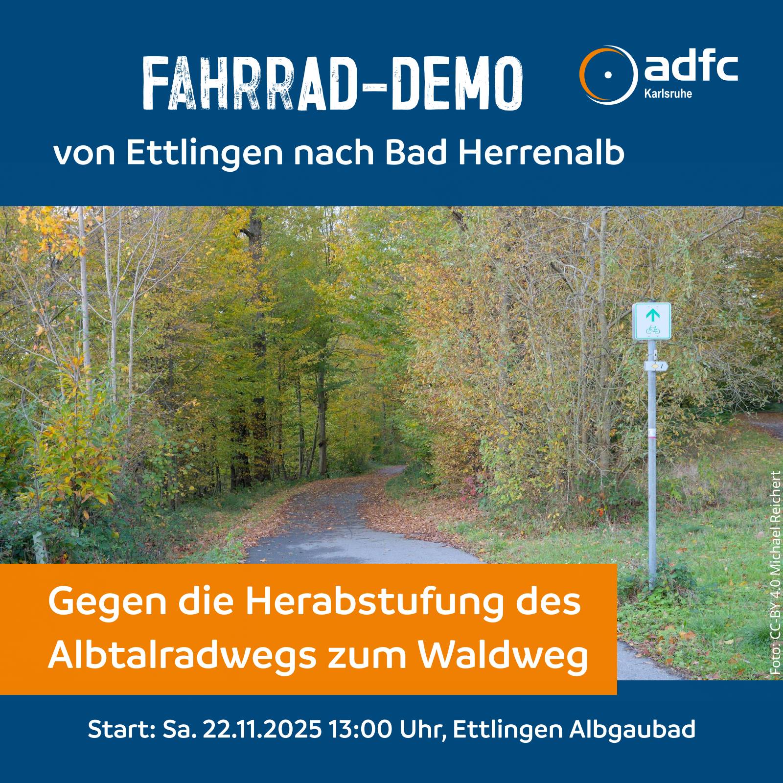 Das Regierungspräsidium Karlsruhe beabsichtigt zum 1. Januar 2026, den Radweg zwischen Busenbach und Bad Herrenalb zum Waldweg herabzustufen. Dagegen demonstrieren wir am 22. November 2025 mit einer Fahrraddemo von Ettlingen nach Bad Herrenalb.