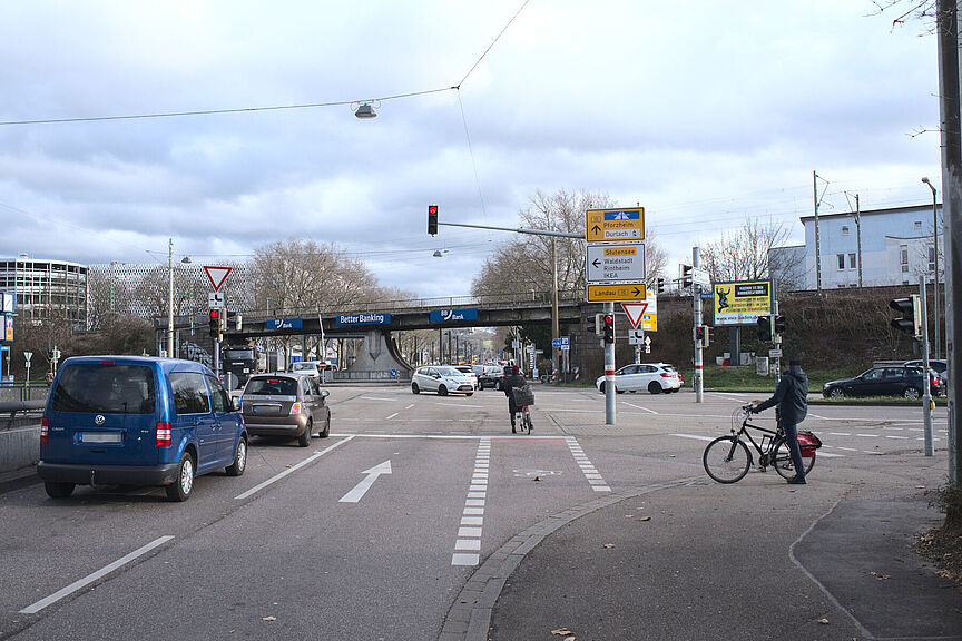 Die zentrale Frage war, ob für Radfahrende von West nach Ost auf dem Fahrradschutzstreifen die Ampel an der abgesetzten Geh- und Radwegfurt oder die Ampel für die Fahrbahn gilt.