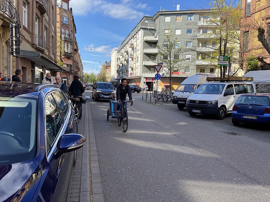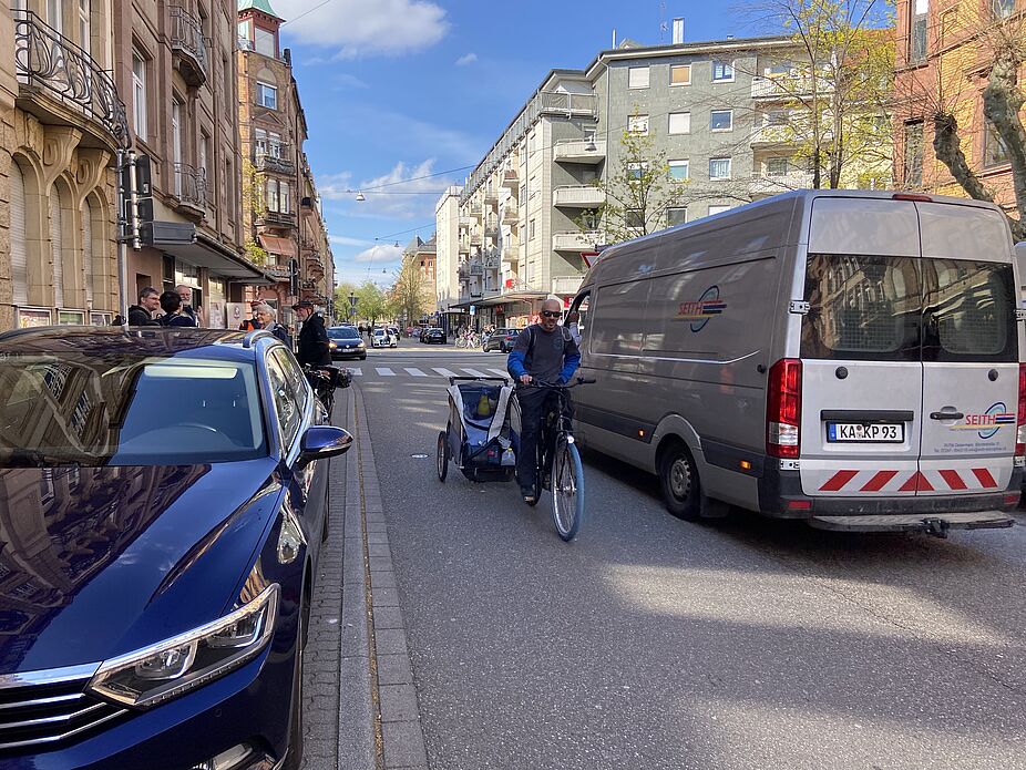 Die zweite Tour des Radverkehrschecks führte uns im April 2022 in die Oststadt und nach Rintheim. Es gab wieder genügend Stellen zu besichtigen, die für Radfahrende unbefriedigend oder gar gefährlich sind und die in der Radverkehrsschau mit den Behörden abgefahren werden sollen.