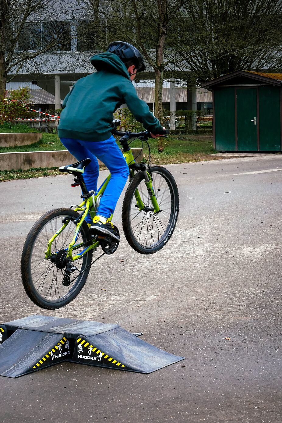 Kinder, Eltern und ADFC-ler treffen sich unter dem Dach in der Nottingham-Anlage. Die Kinder sausen mit Rädern, Rollern, Laufrädern, zu Fuß oder mit dem Dreirad über die kleine Sprungschanze, rasen kreuz und quer über den Platz und schauen, ob sie durch die Slalomstrecke gefahren kommen, ohne über ein Seil zu fahren.