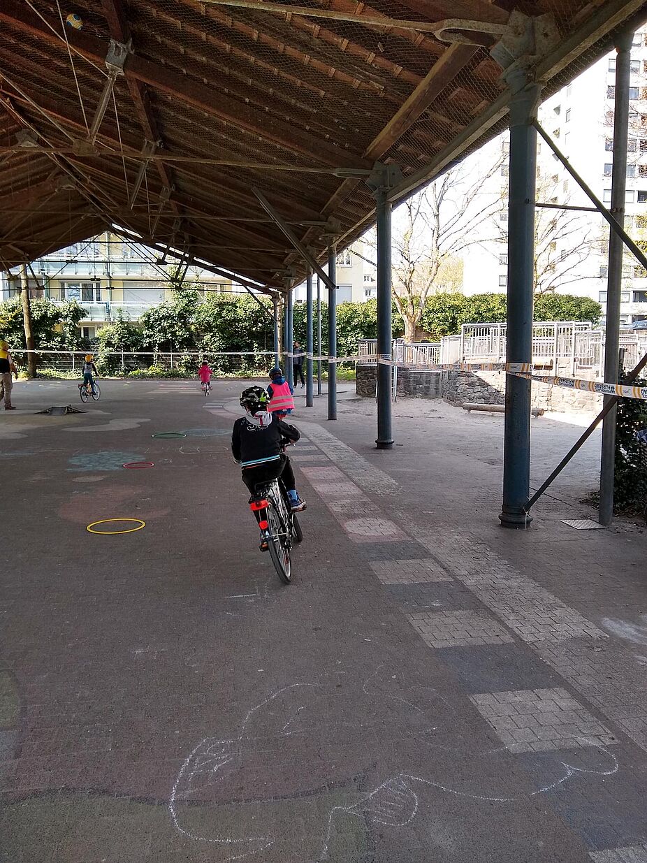 Auf dem großen Sportplatz haben die Kinder z.B. Fahrradlangsamfahren, Parallelfahren, Ball aufnehmen und in den Basketballkorb werfen geübt, konnten beweisen wie schnell sie eine Vollbremsung hinlegen oder wie gut sie durch den Slalompark kamen, ohne die Hütchen umzuwerfen.