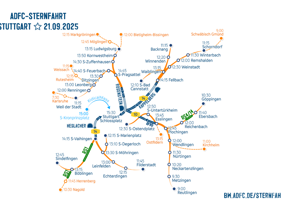 Zubringerdemos zur Radsternfahrt führen schon ab 7:30 Uhr Richtung Stuttgart (z.B. aus Karlsruhe). Bei jedem Wetter starten ab 9 Uhr Demos von elf verschiedenen Startpunkten aus nach Stuttgart. Mit Polizeieskorte demonstrieren sie unter dem Motto „Ab aufs Rad! Gemeinsam sicher ankommen“. Zusammen mit der Kidical Mass enden sie voraussichtlich um 15:30 Uhr am Schlossplatz. Ab 16 Uhr werden dort Winfried Hermann, Cem Özdemir, Thomas Dörflinger als Vertretung von Manuel Hagel sowie die verkehrspolitischen Sprecher*innen der Landtagsfraktionen und der Linken sprechen.